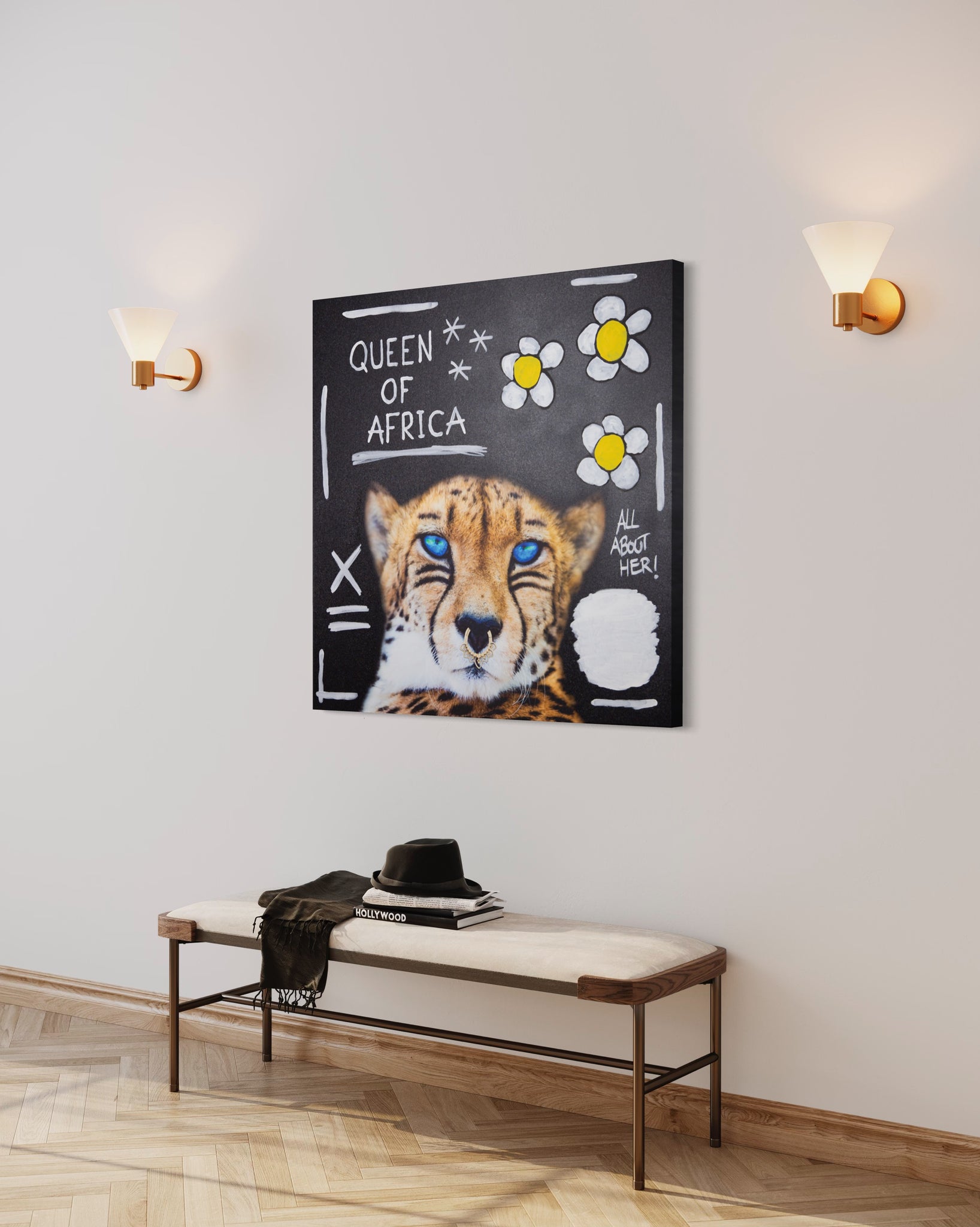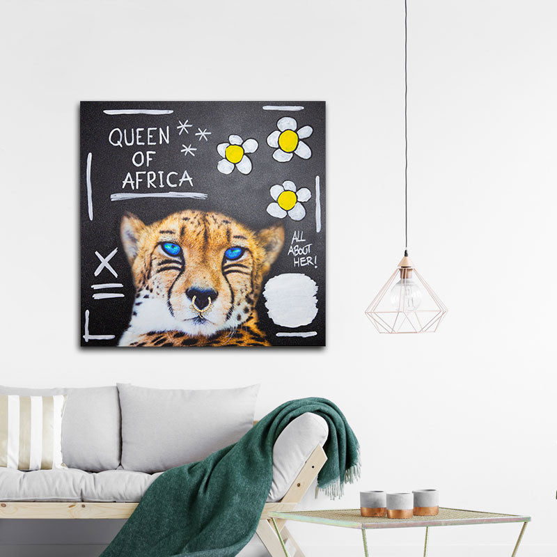 Mellemstort digitalt værk printet på lærred med street art inspireret tekst og motiver.