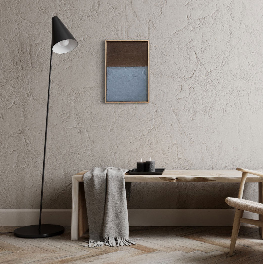 Mindre værk med en rolig balance mellem den brune og blå farve.