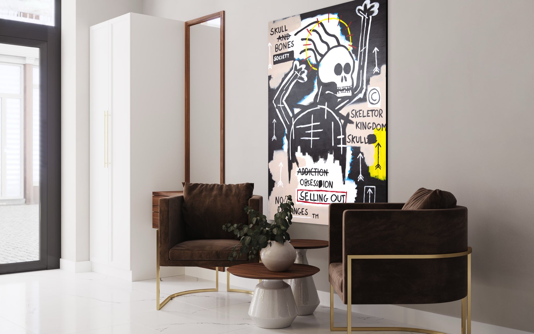 Stort ekspressivt værk i mørke toner og med en god kontrast mellem det kaotiske og rolige.