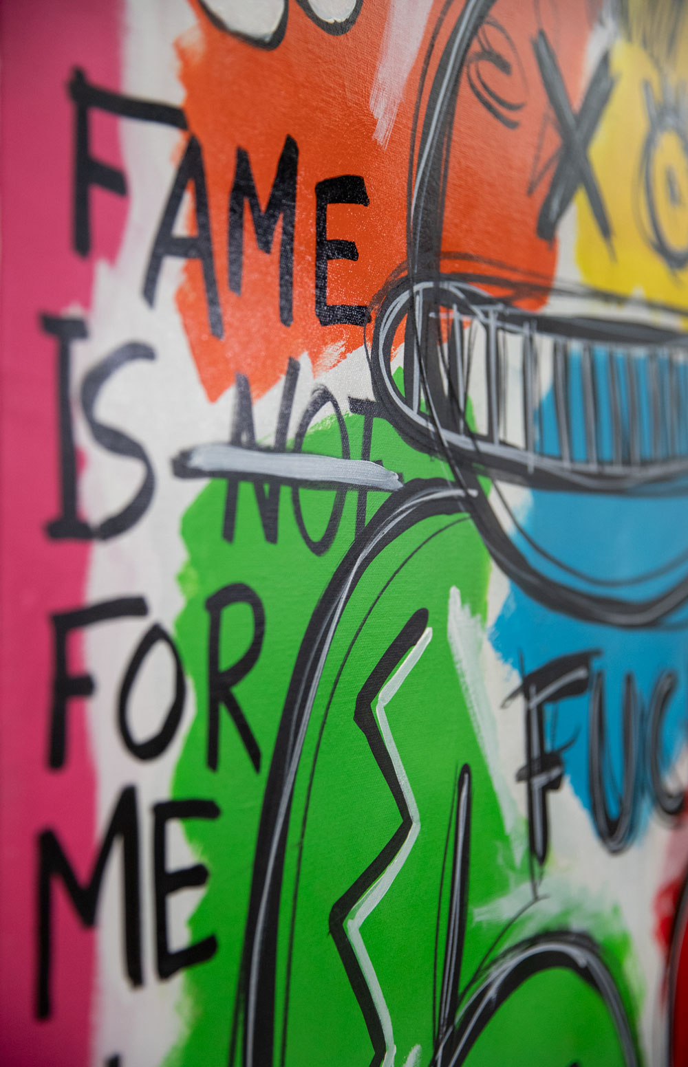 Farverigt mellemstort maleri med en kombination af street art inspirerede tags og et kaotisk selvportræt.